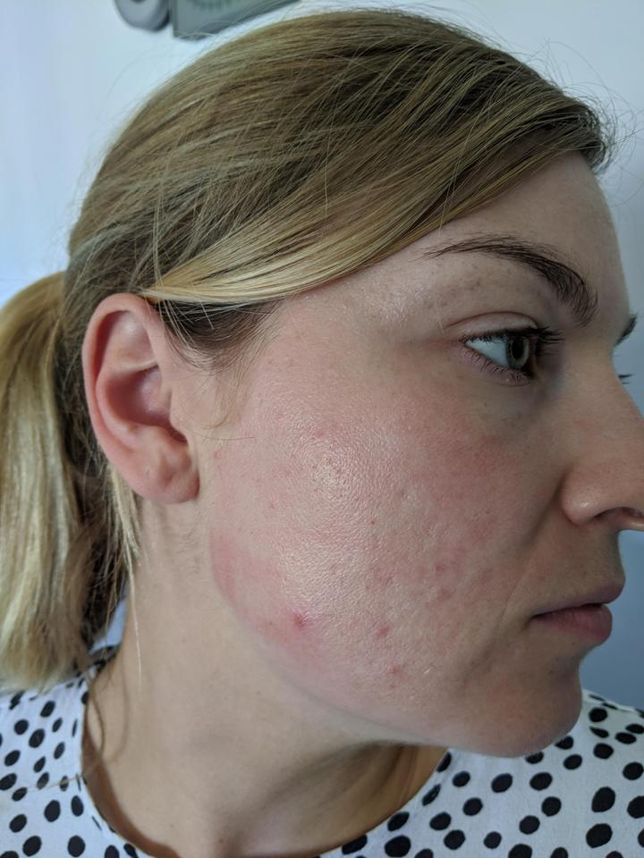Most of my face broke out into full on acne, which came on quite suddenly. It felt very alarming, scary and isolating. None of my friends seemed to have acne anywhere near to this extent and I just felt embarrassed.