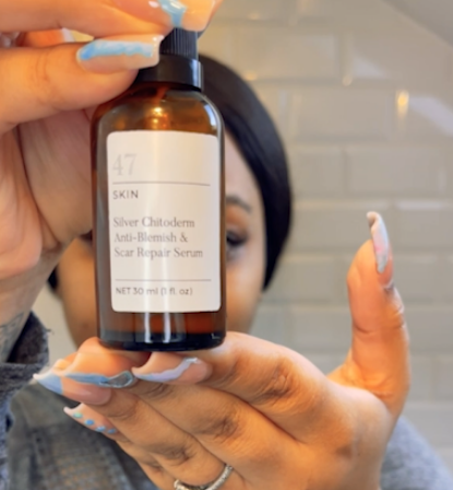 She rinses her face to remove any bits of mask left behind and applies her Anti-Blemish & Scar Repair Serum. She puts 2 pumps in between her fingers and massages it over her face and neck.
