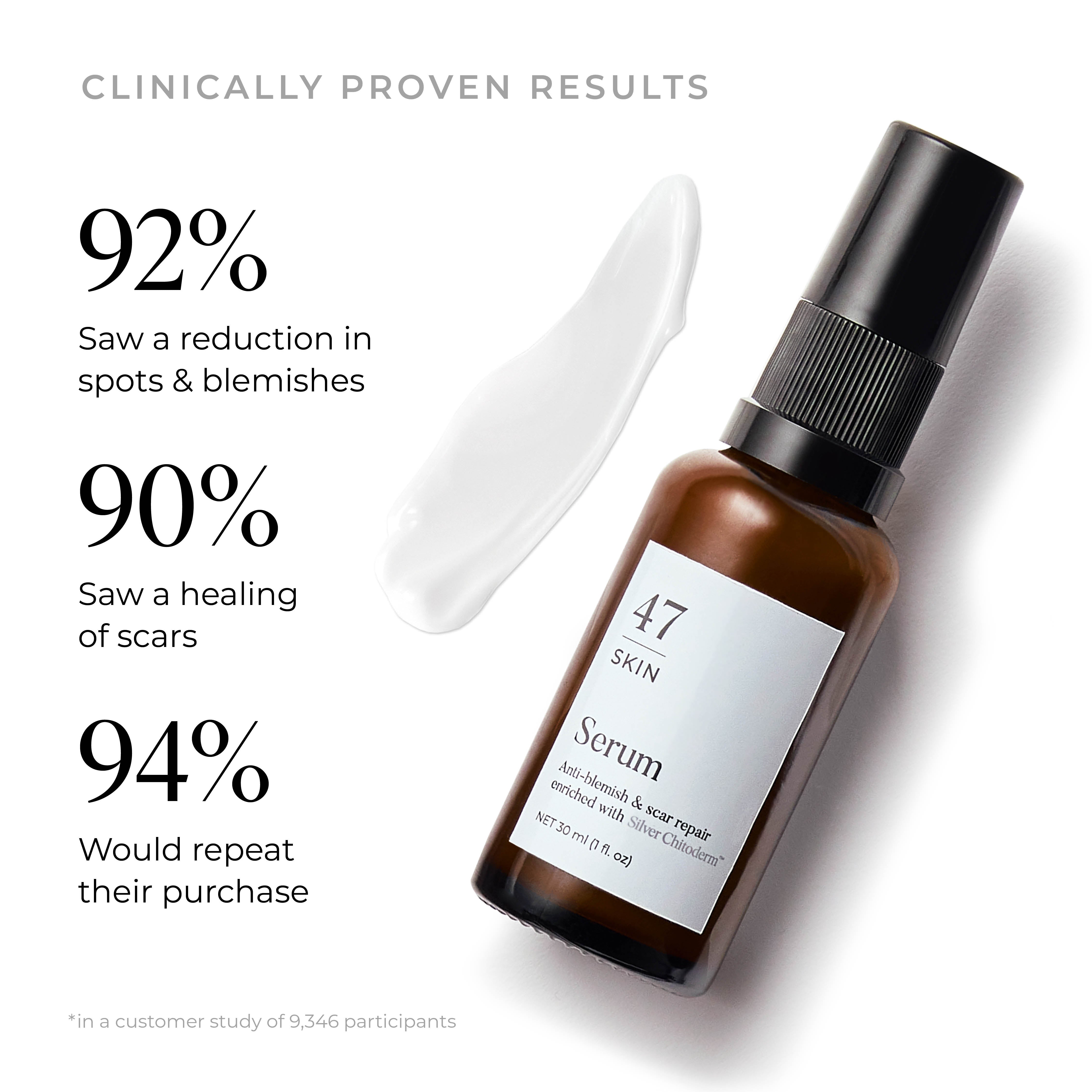 Only 47 Skin products contain our unique ingredient Silver Chitoderm®.Before 47 Skin, finding a product that visibly improves the appearance of blemishes and marks, while keeping your skin hydrated was a challenge. But now, Silver Chitoderm® changes everything.It's clinically tested, science-backed and dermatologist-approved, working naturally to: